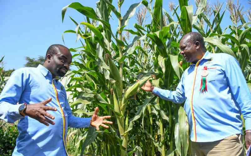‎Nakuru ASK Chairman Perminus Migwi and Marketing Chair David Mwangi inspect maize at the Nakuru ASK Show grounds on June 16, 2025. [Kipsang Joseph, Standard]